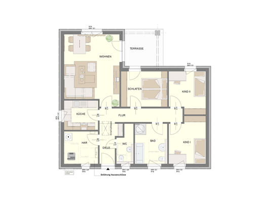 Der 4-Zimmer-Bungalow bietet einen großzügigen Wohnbereich, ein Schlafzimmer sowie zwei Kinderzimmer. Ergänzt wird das Raumangebot durch Küche, Bad und Hausanschlussraum (HAR). Das durchdachte Raumkonzept macht den Unverbesserlichen B540 zu einem besonders preisgünstigen Bungalow, der sich flexibel an unterschiedliche Lebenssituationen anpassen lässt.